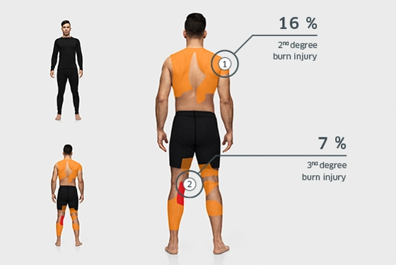 In addition to the burn injuries shown in the illustration, scalding injuries may occur caused by moisture. Your body’s own perspiration often causes burn injuries. If the perspiration remains on your skin, it may overheat and start boiling. Because of this, it is very important to use underwear with good moisture transporting properties, such as wool. Garments containing synthetic fibres will melt and cause severe skin injuries.